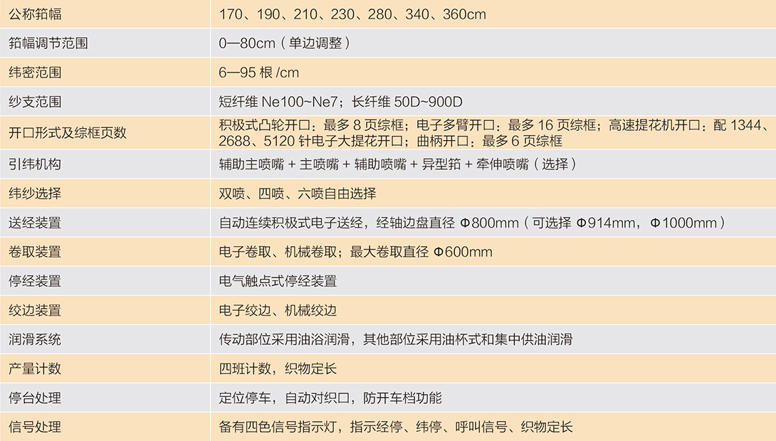 該機(jī)采用模塊組合式設(shè)計(jì)概念,高剛性的機(jī)架,加寬的箱型墻板,獨(dú)特的打緯平衡機(jī)構(gòu),精確的引緯控制技術(shù),造就一款高速、低振動(dòng)、節(jié)能和智能化的新型噴氣織機(jī)。